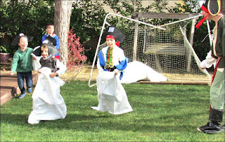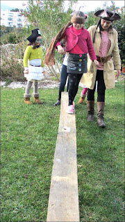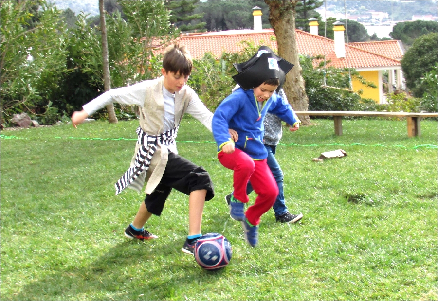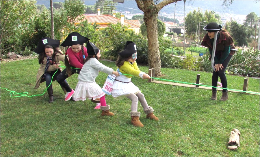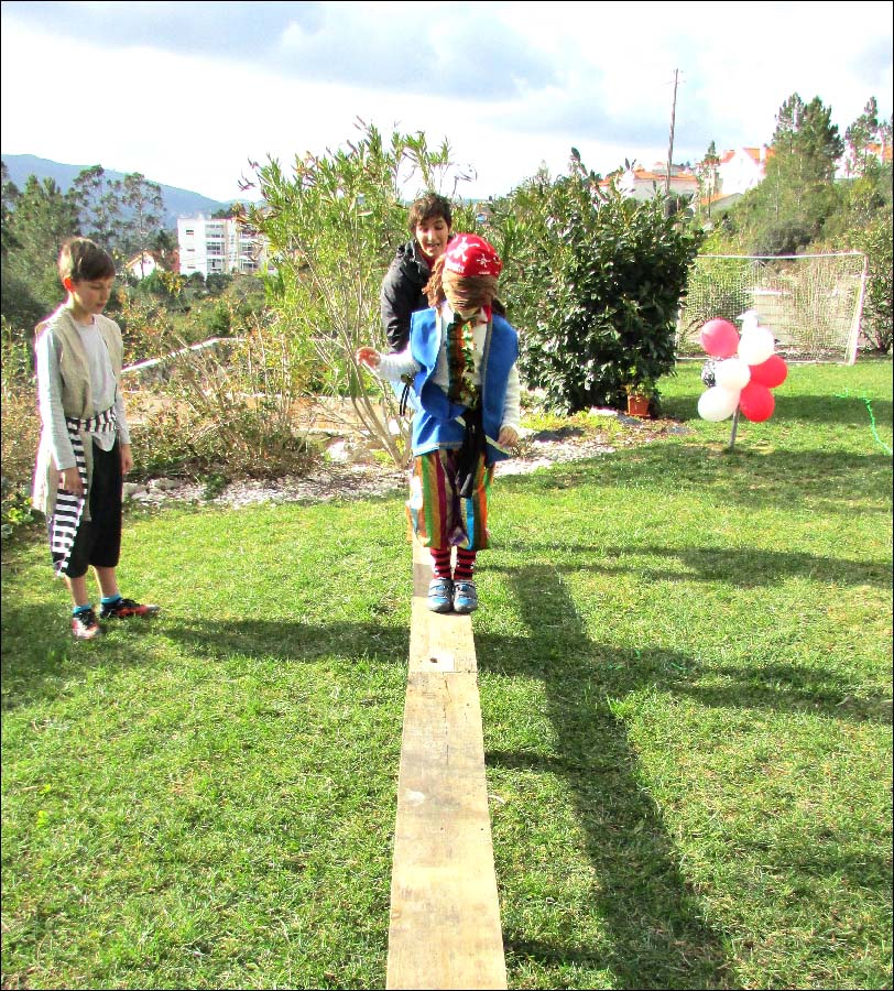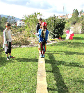 A minha Vi é uma planificadora por excelência. Gosta de imaginar, organizar, planificar, e nunca me deixa fazer "uma coisinha simples", ao contrário, tem sempre grandes ideias, grandes planos e nem pondera que os mesmos não se concretizem. Juntas, com a madrinha e a tia, idealizamos alguns jogos para tornar a tarde bem animada. Os jogos consistiam numa gincana de jogos Pirata, nos quais as equipas somavam pontos. A equipa mais pontuada ganhava o tesouro. Içar as velas, o mar dos tubarões, atira à espada, pirata comilão, corrida de marujos, pescaria pirata, andar na prancha, estes eram alguns dos jogos que inventámos.