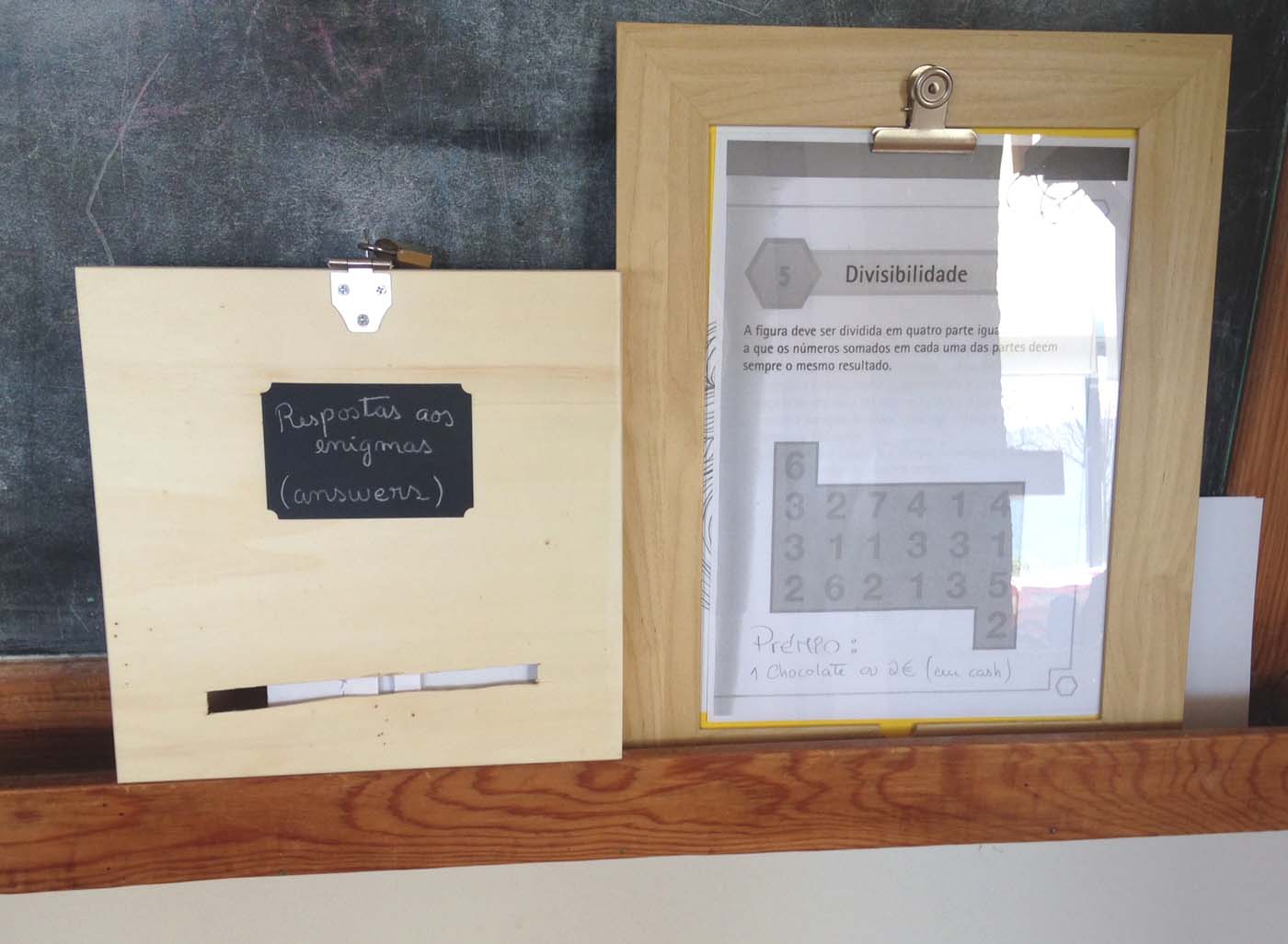 Todas as semanas há um novo enigma para resolver no nosso quadro de ardósia. Enigmas que obrigam a pensar, a fazer contas, a estimular o raciocínio lógico. Todos podem responder e todos tentam a sua sorte: membros da família, visitas, amigos, e até os padres que cá estiveram em casa. O enigma surge à segunda feira e, até domingo à noite, as respostas são colocadas numa urna, fechada a cadeado. Na segunda, com o novo enigma, surge também a solução do anterior (só em posse da avó Bé), e apuramos o(s) vencedor(es). Os prémios são tão tentadores como chocolates Milka e euros que podem ser acumuláveis e convertíveis em prémios materiais de maior valor.